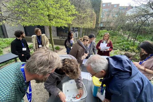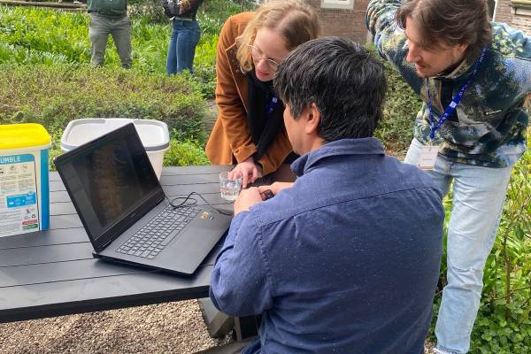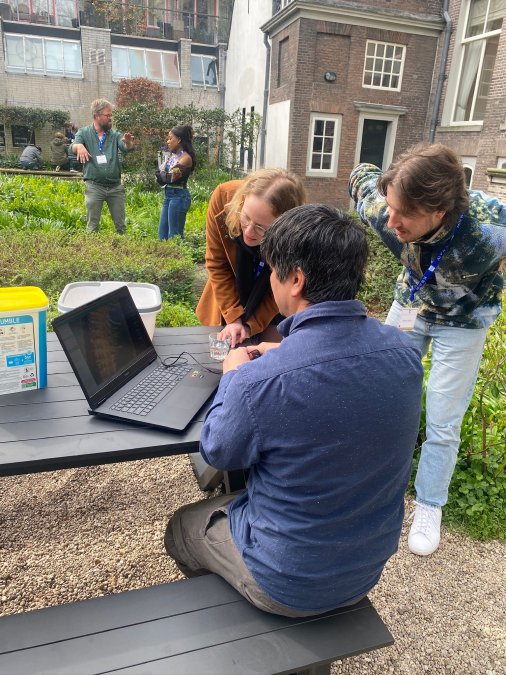 After first learning about soil biodiversity and soil health benchmarking, the participants were guided in a second part to get up close with some soil fauna themselves. In collaboration with Bodemdierendagen they gathered in small groups and carefully dug up the soil in the Trippenhuis garden and searched for life, examining the soil biodiversity under a mini-digital microscope attached to a laptop.